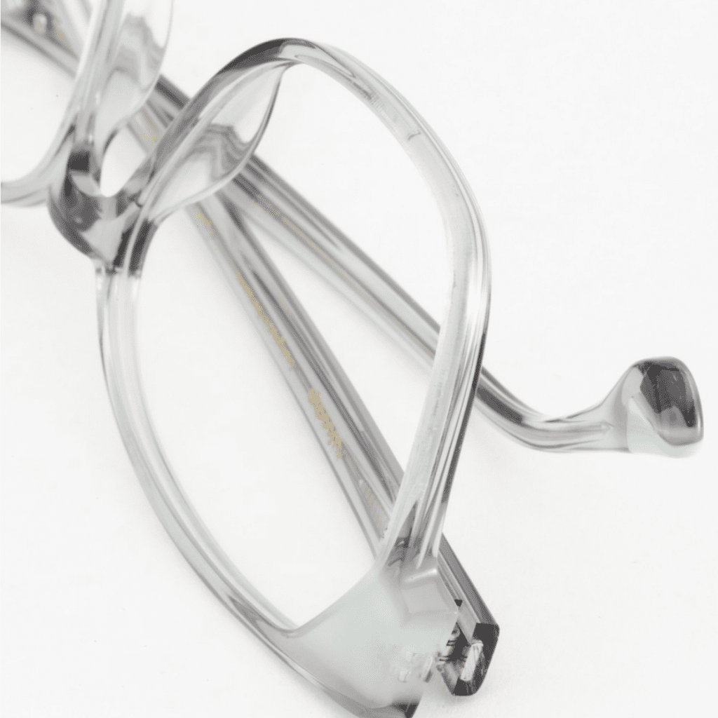 Montura de acetato italiano con laminado en los talones. Varillas de acetato fresado e incrustación de madera en el terminal. Bisagras alemanas OBE Spike.